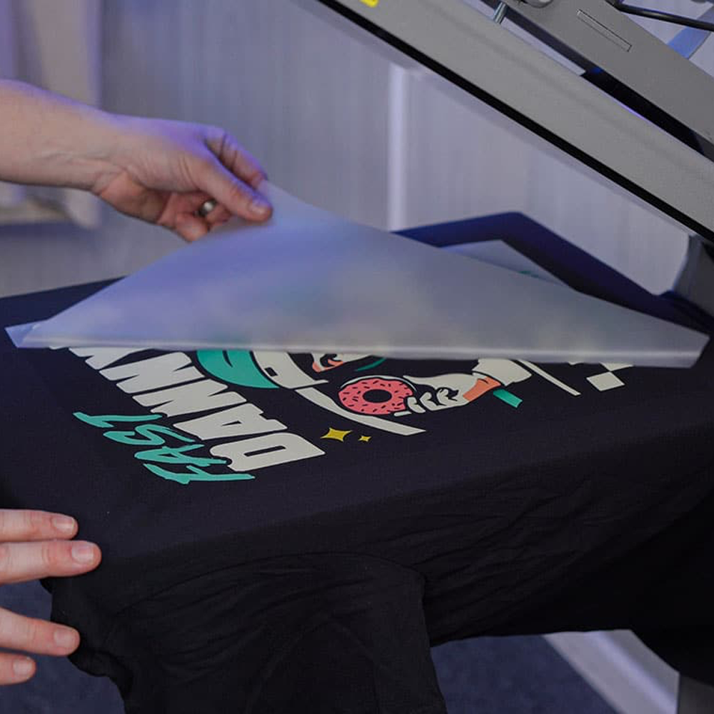 DTF printing offers bold, full-color prints with incredible durability across a wide range of fabrics. Your design is printed onto a special film, powdered with adhesive, and then heat-pressed onto the garment—creating a vibrant, flexible print that holds up wash after wash. DTF is ideal for designs with lots of color and detail, even on dark or hard-to-print items.